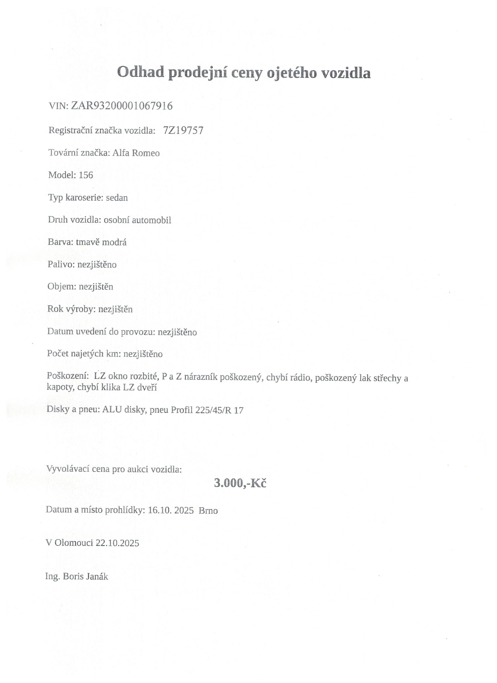 Jedná se o ojeté silniční vozidlo tovární značky ALFA ROMEO, bez RZ, VIN: ZAR93200001067916, barva modrá metal. K vozidlu nejsou k dispozici klíče, technické průkazy ani žádná dokumentace.