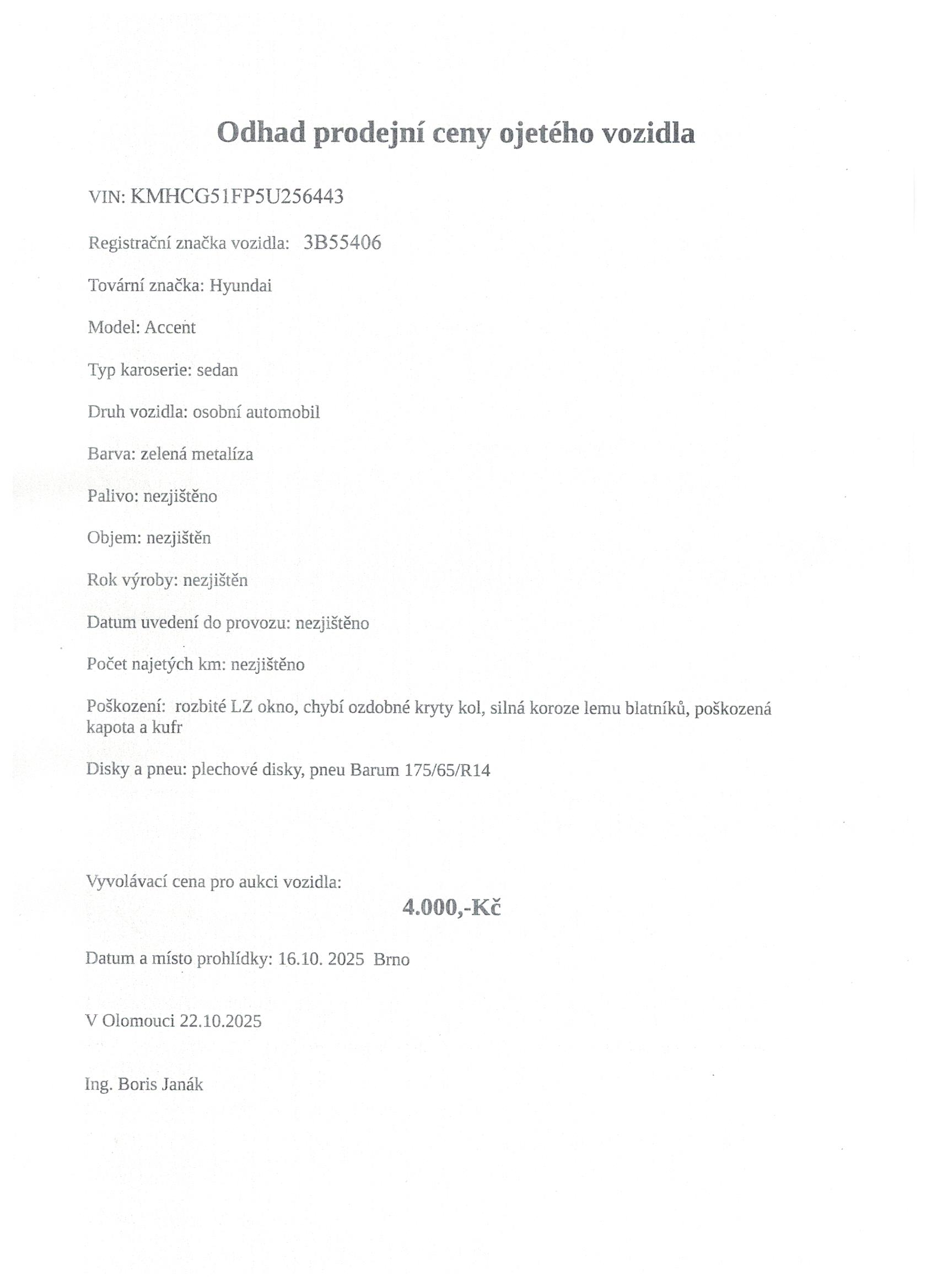 Jedná se o ojeté silniční vozidlo tovární značky HYUNDAI ACCENT, RZ 3B55406, VIN: KMHCG51FP5U256443, barva zelená metal. K vozidlu nejsou k dispozici klíče, technické průkazy ani žádná dokumentace.