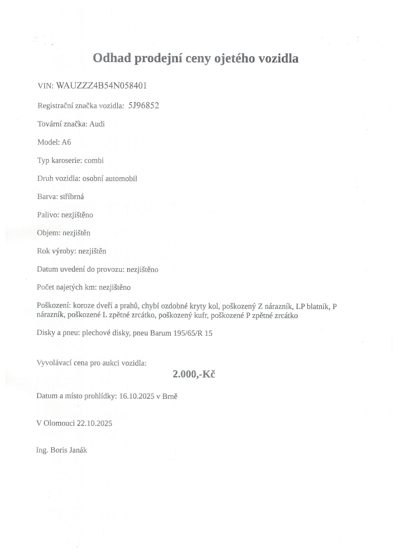 Jedná se o ojeté silniční vozidlo tovární značky AUDI A6, RZ 5J96852, VIN: WAUZZZ4B54N058401, barva šedá. K vozidlu nejsou k dispozici klíče, technické průkazy ani žádná dokumentace.