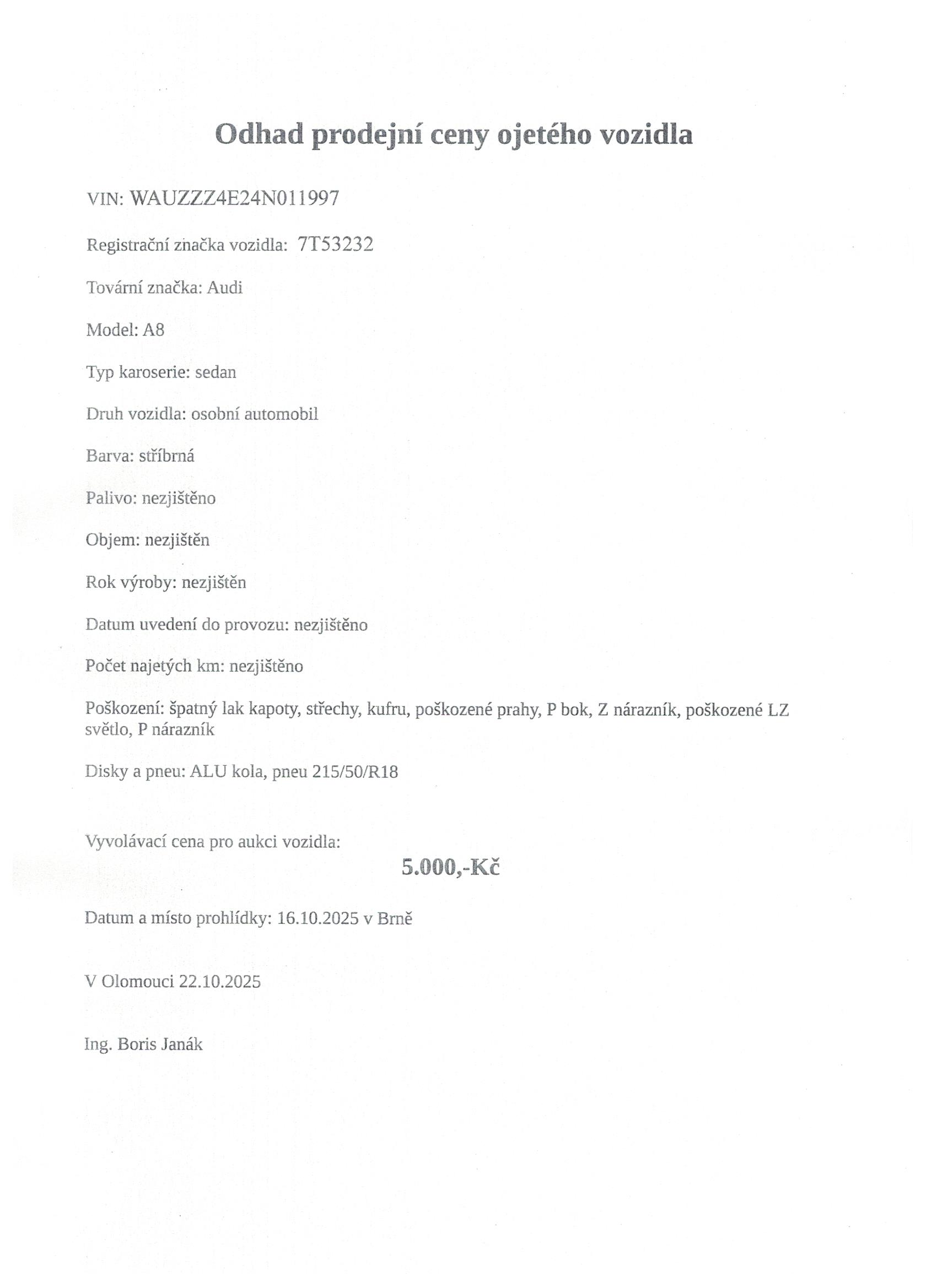 Jedná se o ojeté silniční vozidlo tovární značky AUDI A8, RZ 7T53232, VIN: WAUZZZ4E24N011997, barva stříbrná metal. K vozidlu nejsou k dispozici klíče, technické průkazy ani žádná dokumentace.