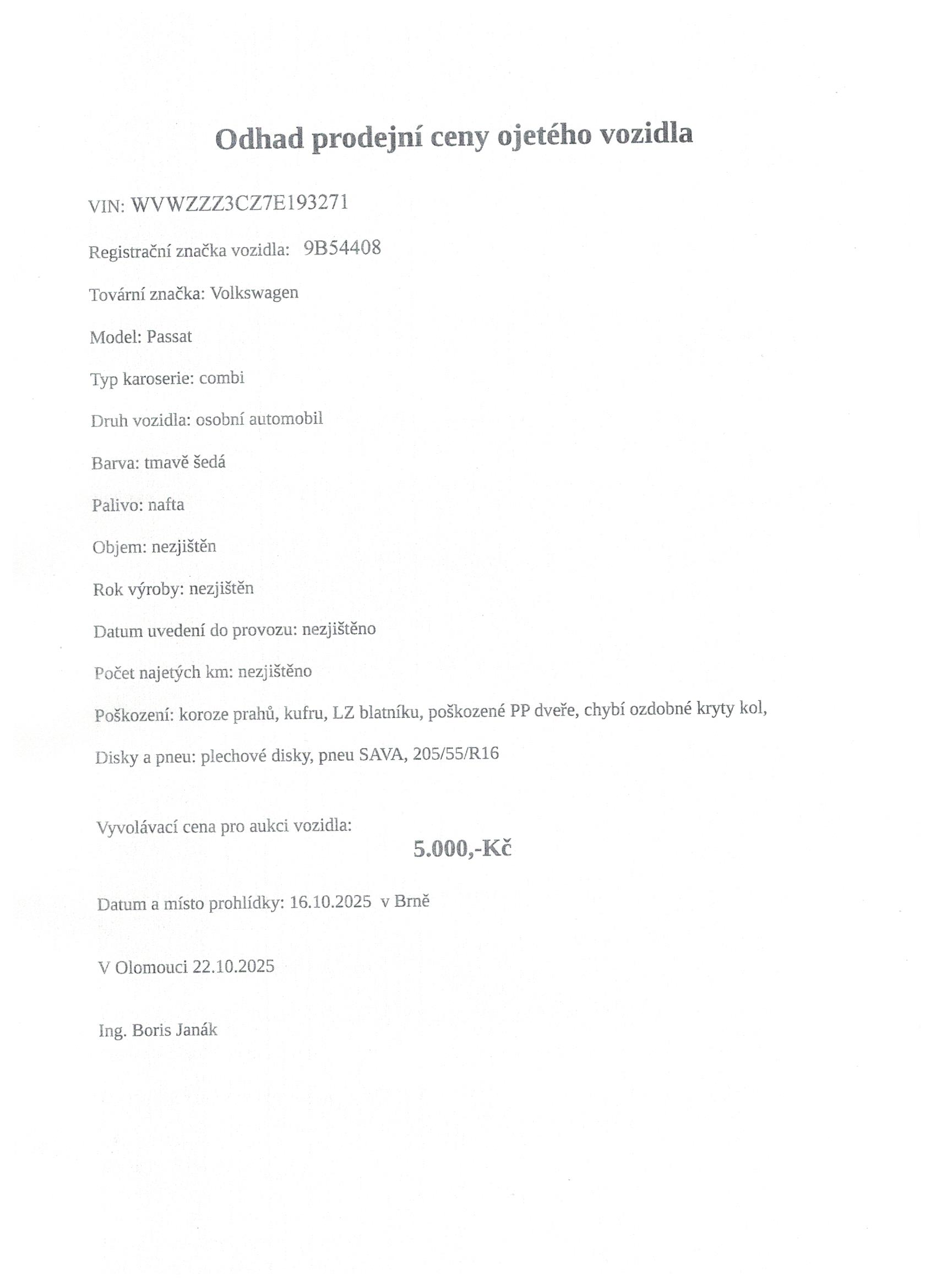 Jedná se o ojeté silniční vozidlo tovární značky VOLKSWAGEN PASSAT, RZ 9B54408, VIN: WVWZZZ3CZ7E193271, barva šedá metal. K vozidlu nejsou k dispozici klíče, technické průkazy ani žádná dokumentace.