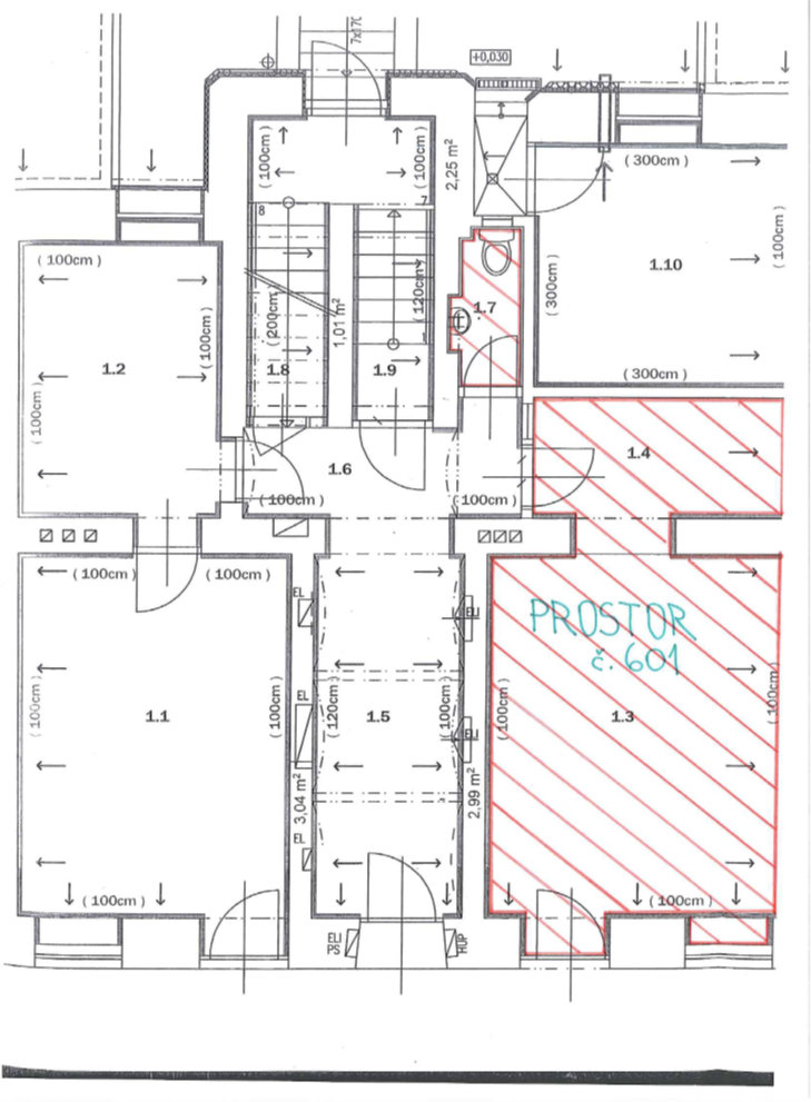 Nebytový prostor má celkovou plochu 26 ma sestává z prodejní místnosti o výměře 20,3 m2 a zázemí o výměře 5,7 m2 - viz půdorys.  Spolu s nebytovým prostorem č. 601 bude nájemce užívat společné WC o výměře 1,9 m2 nacházející se v přízemí výše uvedené budovy, které je přístupné přes společné prostory budovy a je společné s nájemcem sousedního nebytového prostoru. V prostoru proběhne do 30.01.2026 výměna dveří včetně zárubní služebního vchodu umístěného ve společné chodbě domu za protipožární dveře.